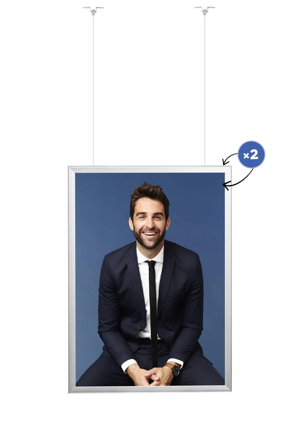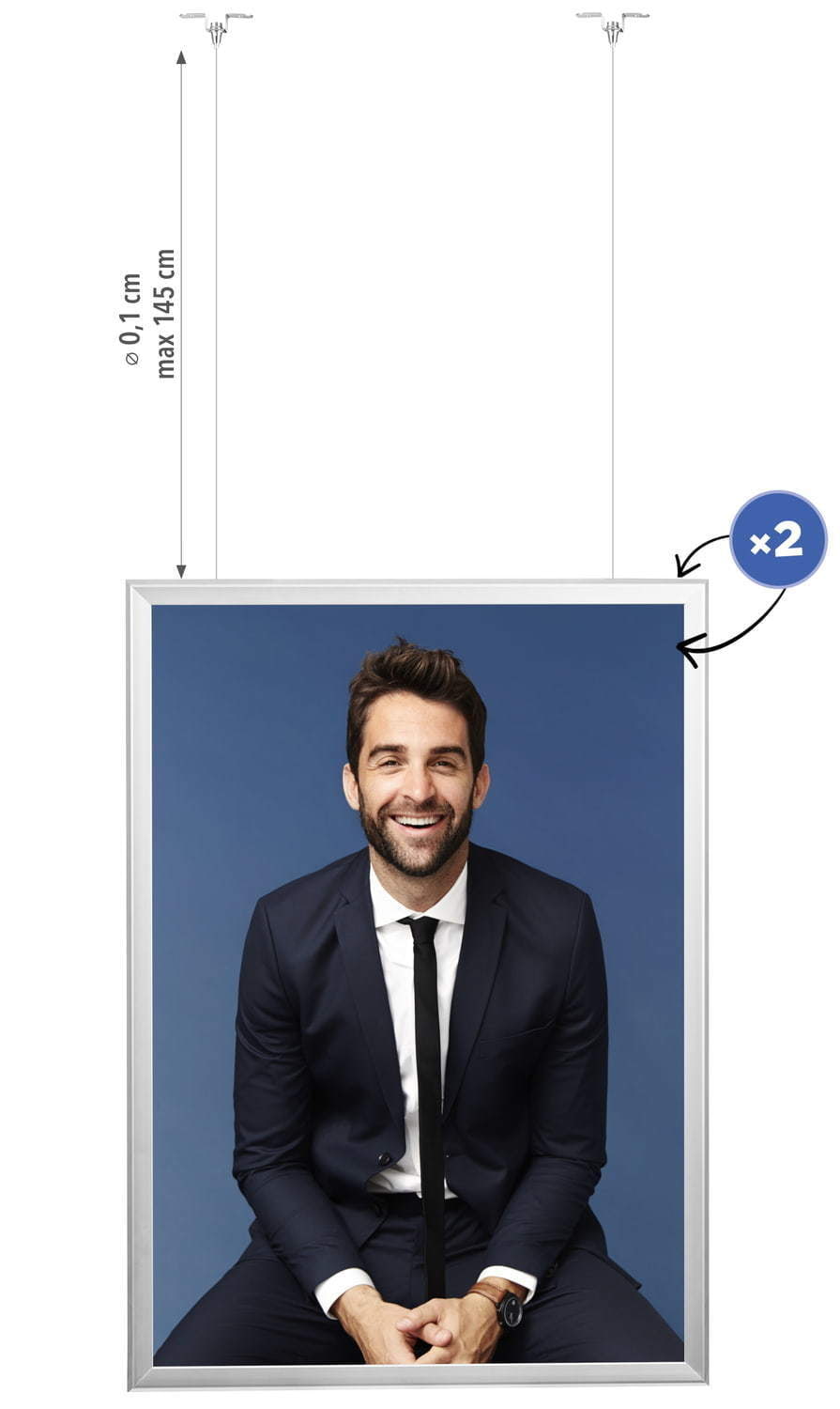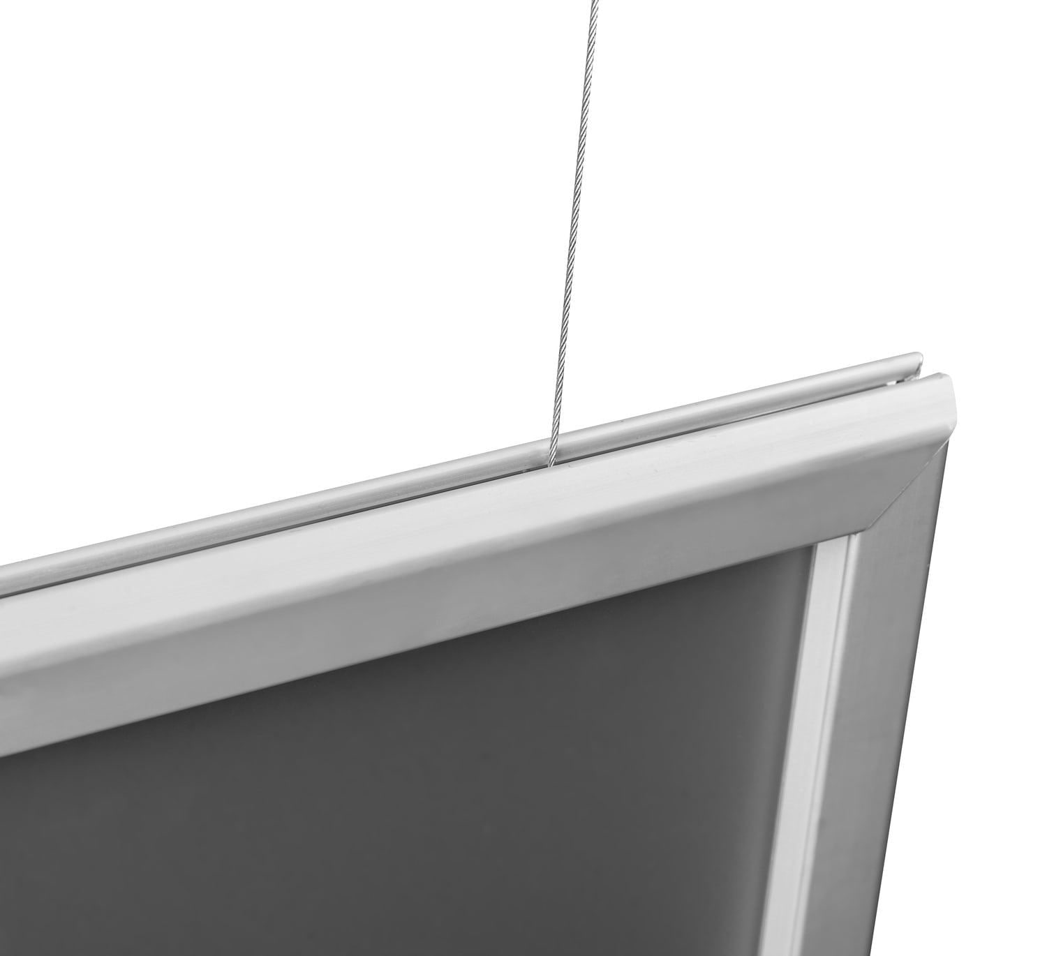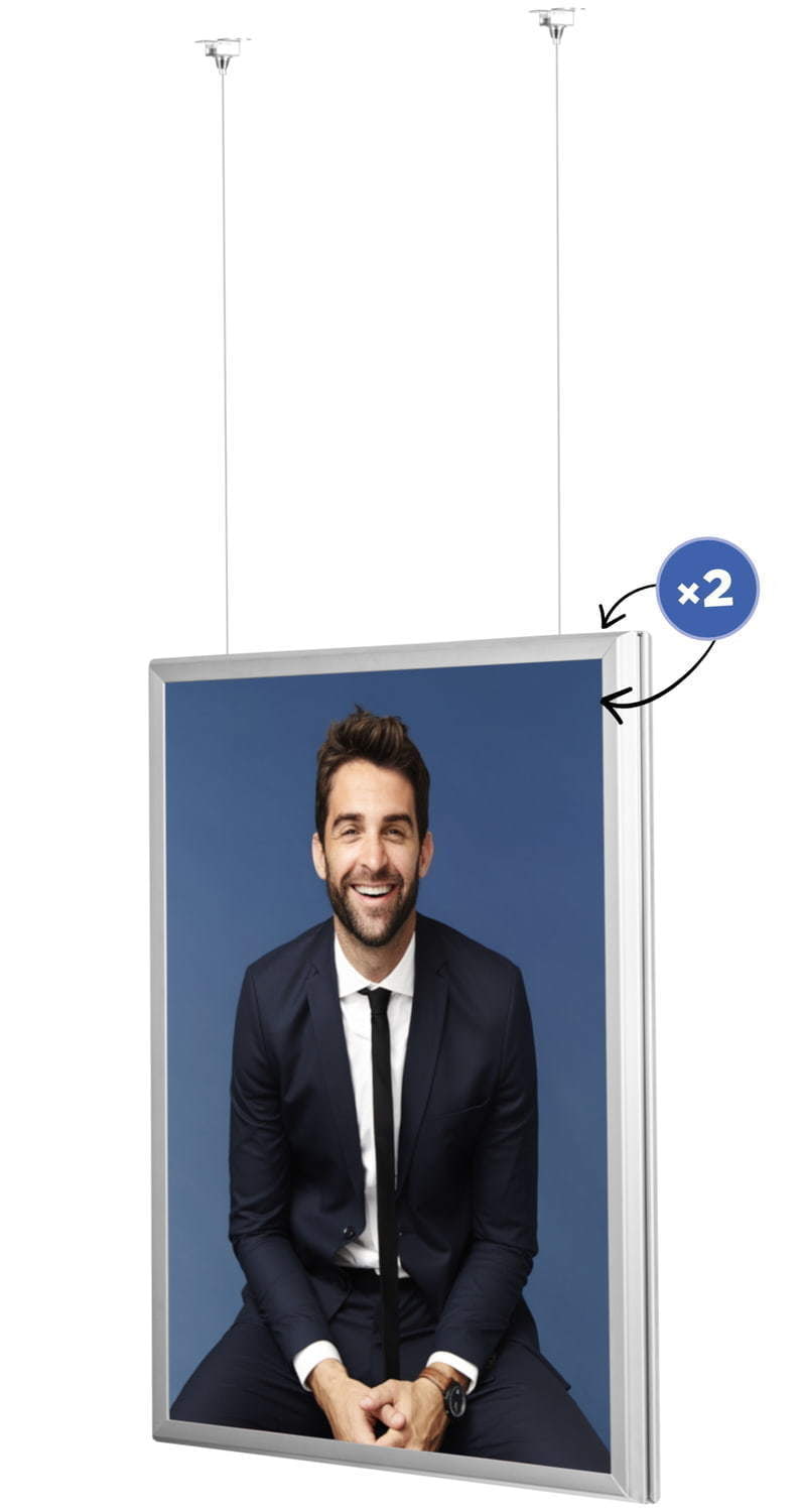 Eine perfekte Lösung für grosse Geschäfte und Einkaufszentren. Der Rahmen vom Typ Premium ermöglicht die Präsentation von Grafiken auf beiden Seiten. Das „Clip-Clap“-System ermöglicht einen schnellen und problemlosen Austausch des Plakats, der nur wenige Sekunden dauert. Ein starkes Stahlseil garantiert eine sichere und stabile Aufhängung des Rahmens. Das Set enthält Halterungen zur Befestigung des Rahmens an der Decke.