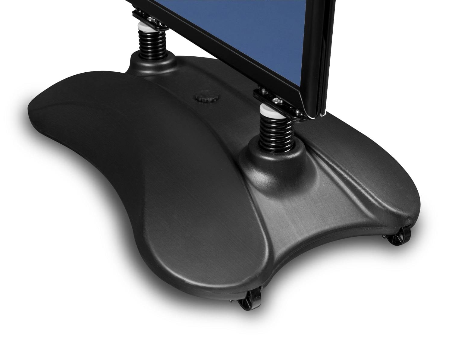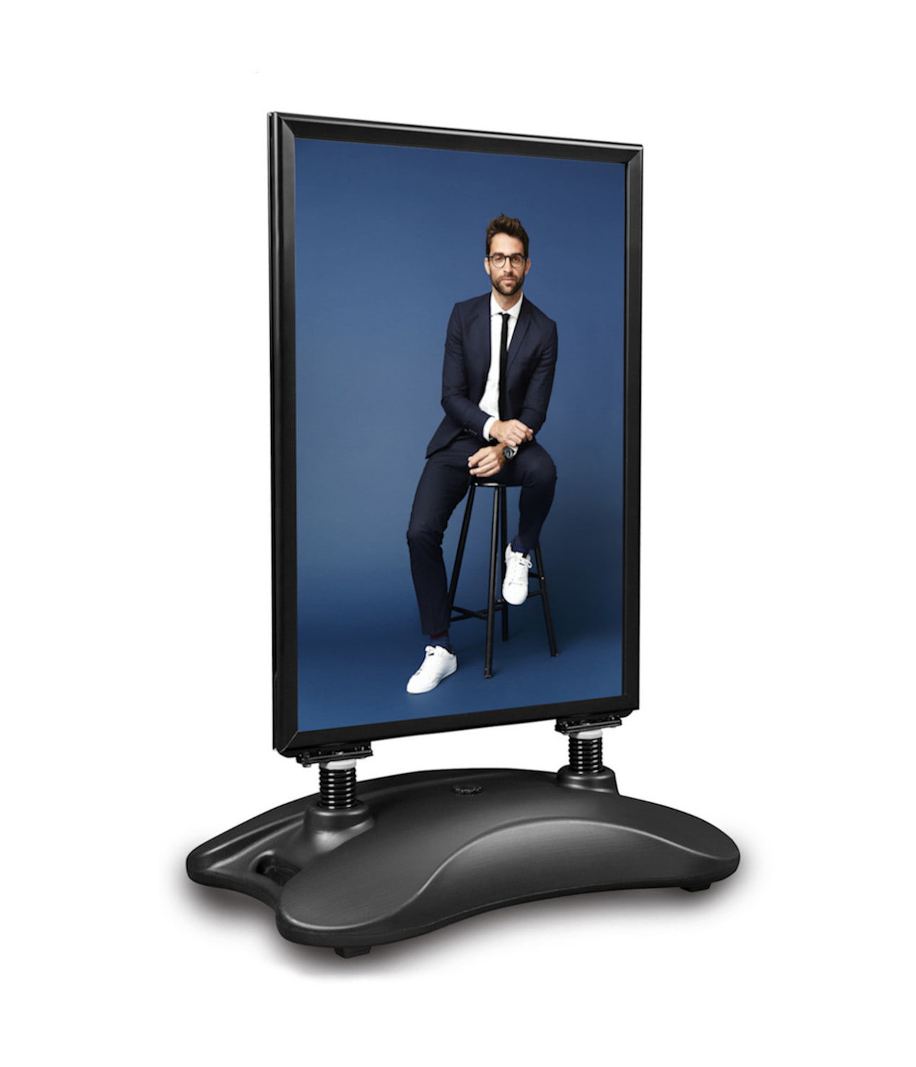 Definitiv der beliebteste Kundenstopper für draußen. Der Rahmen ist auf Federn gelagert, so dass sich der Passantenstopper der Windkraft anpasst. Die Basis ist ein Wassertank. Nach dem Befüllen wird der Kundenstopper sehr schwer. Seine Handhabung ist dank des Griffs und der im Sockel montierten Räder möglich. Das Poster wird als Schnappverschluss-Rahmen aufgerastet. Die dicke Hülle, die das Plakat bedeckt, hat einen UV-Filter, der den Ausdruck vor Farbverlusten unter dem Einfluss von Sonnenlicht schützt. Rahmenprofil: 32 mm.
