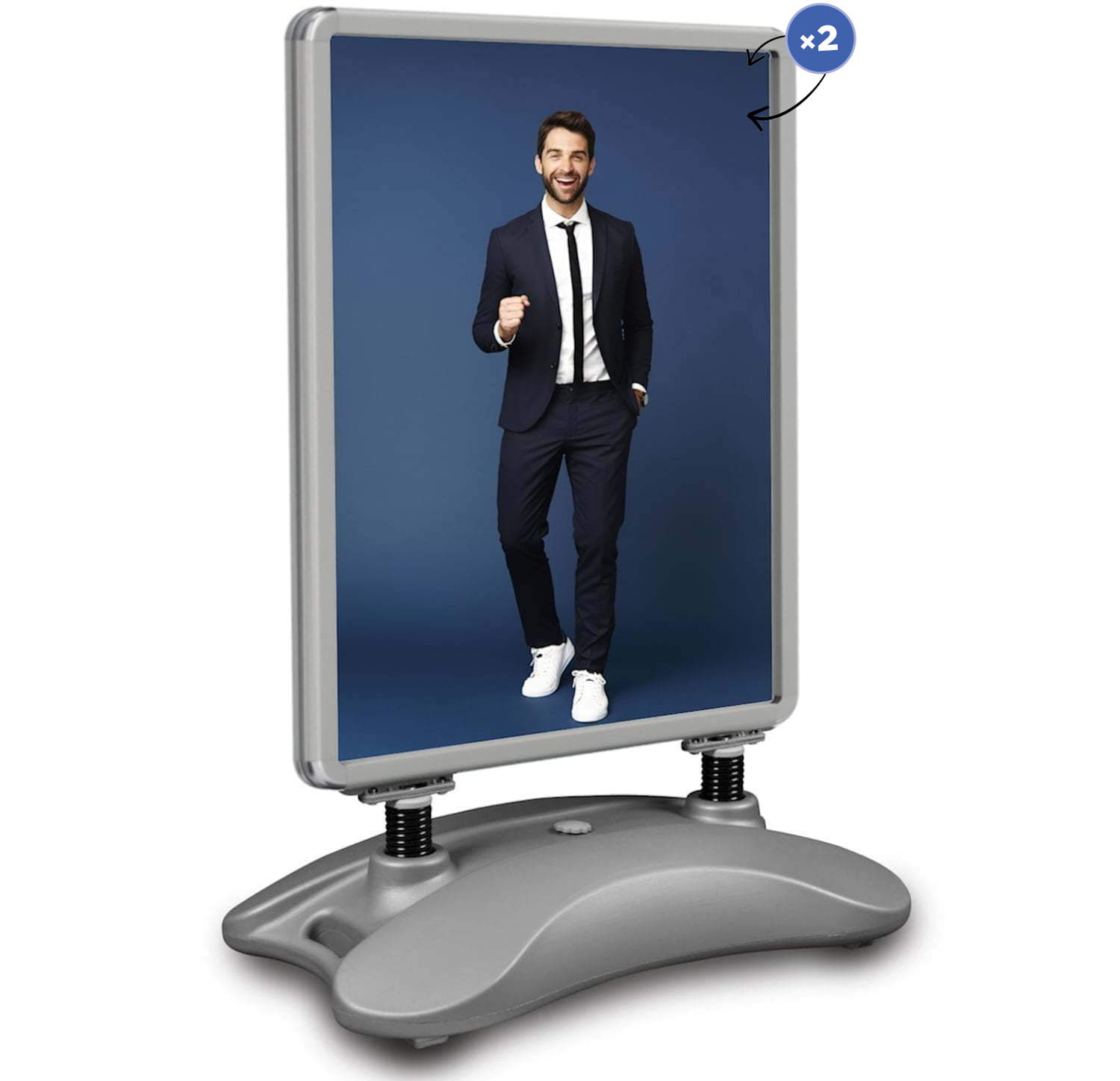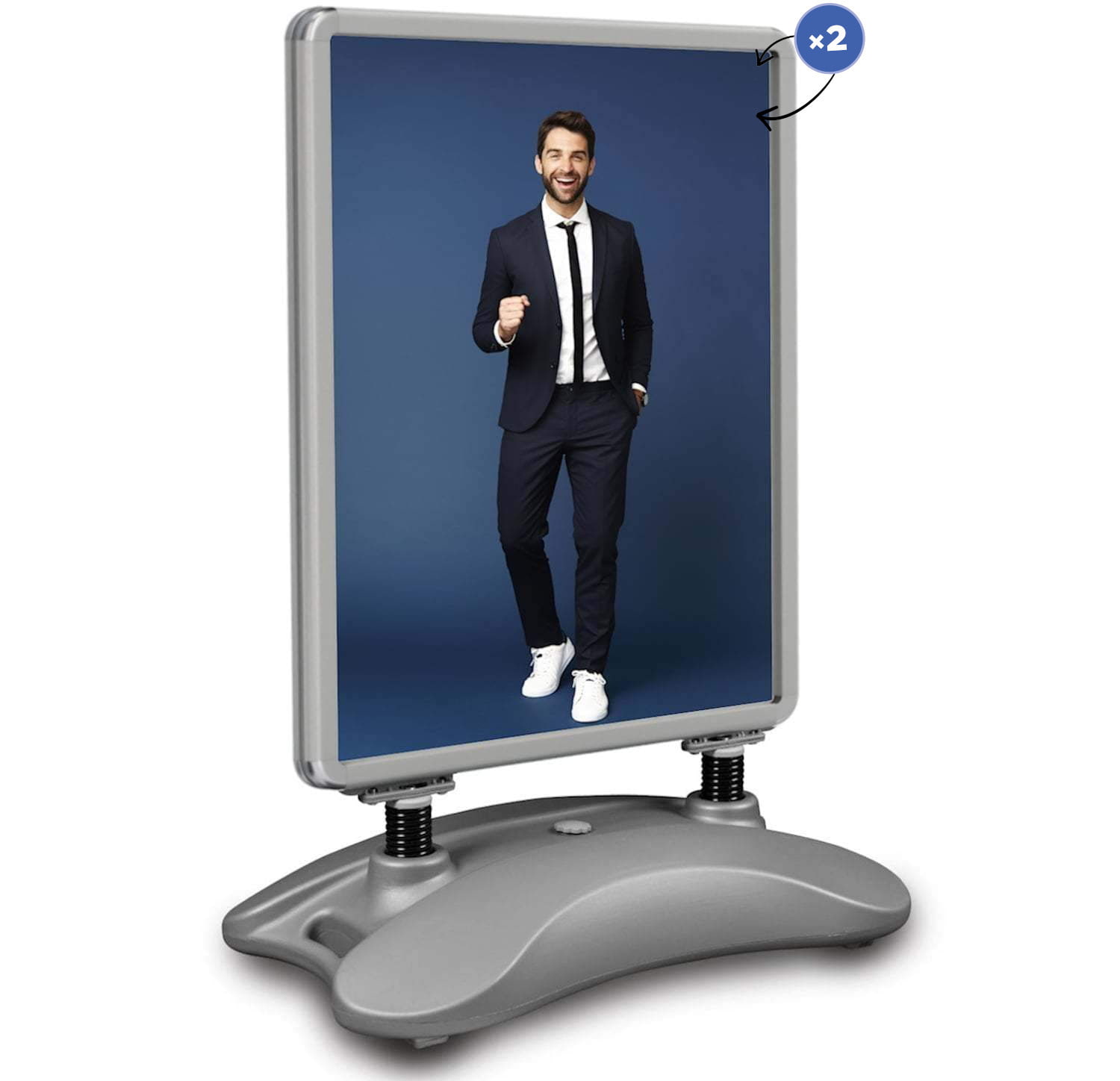 Definitiv der beliebteste Kundenstopper für draußen. Der Rahmen ist auf Federn gelagert, so dass sich der Passantenstopper der Windkraft anpasst. Die Basis ist ein Wassertank. Nach dem Befüllen wird der Kundenstopper sehr schwer. Seine Handhabung ist dank des Griffs und der im Sockel montierten Räder möglich. Das Poster wird als Schnappverschluss-Rahmen aufgerastet. Die dicke Hülle, die das Plakat bedeckt, hat einen UV-Filter, der den Ausdruck vor Farbverlusten unter dem Einfluss von Sonnenlicht schützt. Rahmenprofil: 32 mm. Dieses Set enthält: Hampton-Kundenstopper verpackt in zwei separaten Boxen.Größe/Format: A0 (841x1189 mm)Gewicht des Produktes: 22 kg (14 kg + 8 kg)Einzelverpackungsabmessungen: 140x95x8 cm + 106x63x14 cmArtikel Nummer: 5907451663554Produktnummer des Herstellers:5907451663554