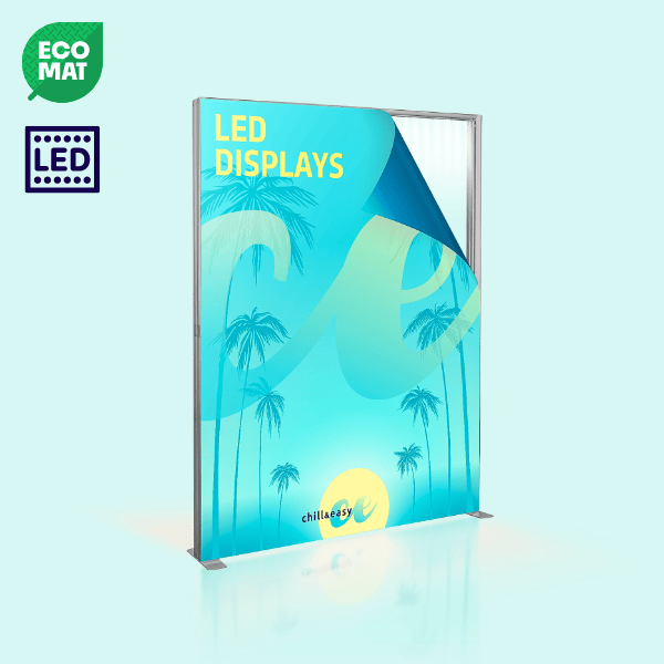 Das Produkt zeichnet sich durch ein Design aus, das auf Schnellanschlüssen für die Stromversorgung der integrierten LED-Beleuchtung basiert. Ein zusätzlicher Abdeckstreifen schützt die Glühbirnen vor Beschädigung oder Bruch. Der Aufdruck wird mit Silikonband befestigt, was eine problemlose und sehr schnelle Montage der Grafik ermöglicht. Die klappbaren Füße und das Aluminiumprofil (10 cm) garantieren wiederum Stabilität, hohe Qualität und eine lange Lebensdauer des Produkts.