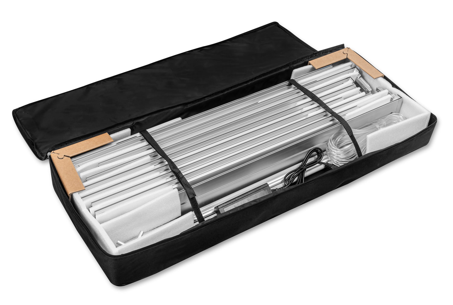 Das Set enthält: LED BOX™ PLUS 200x200 Messewand, Netzteil (1 Stück), Silikonband, Transporttasche, individuell bedruckte Banner (falls bestellt).