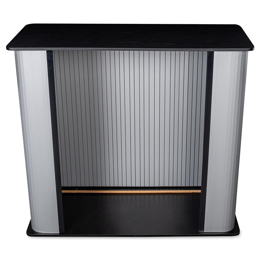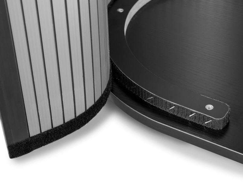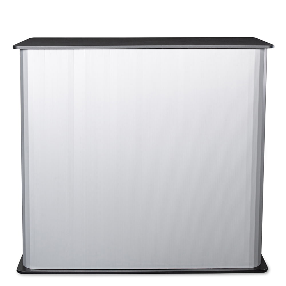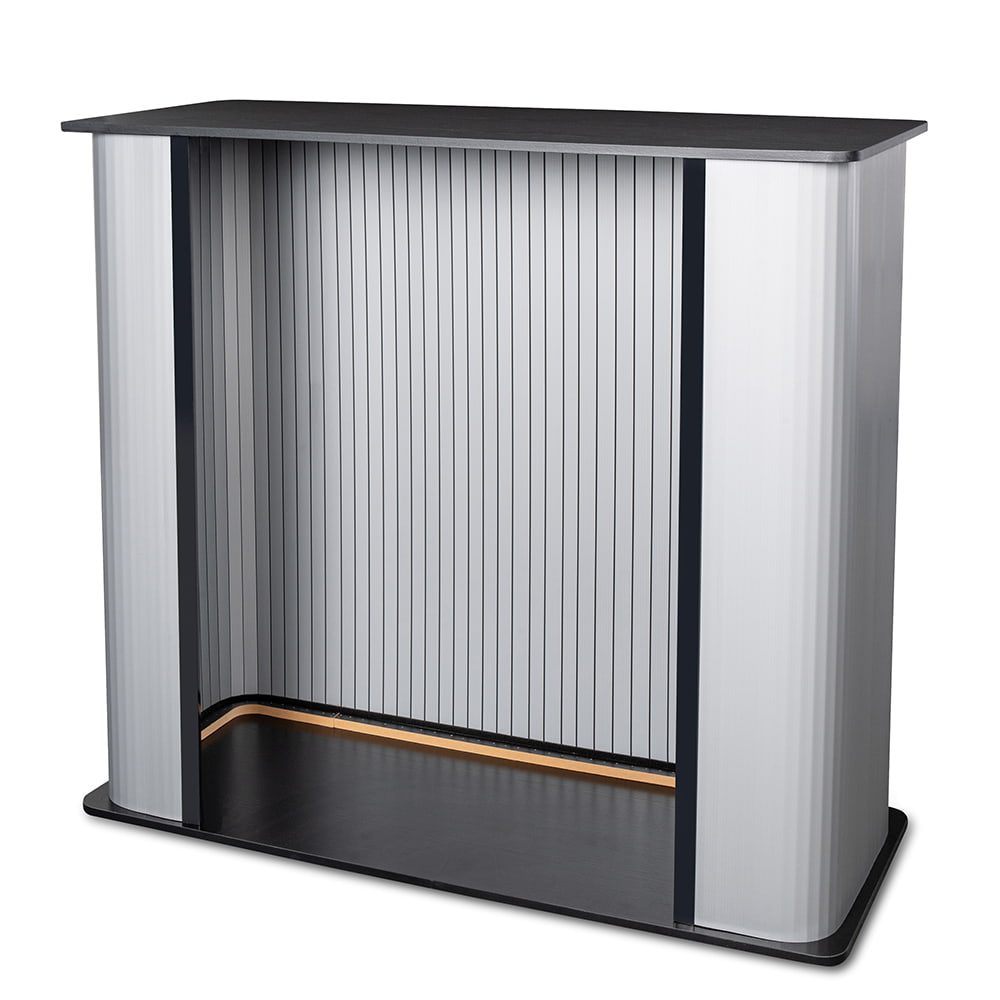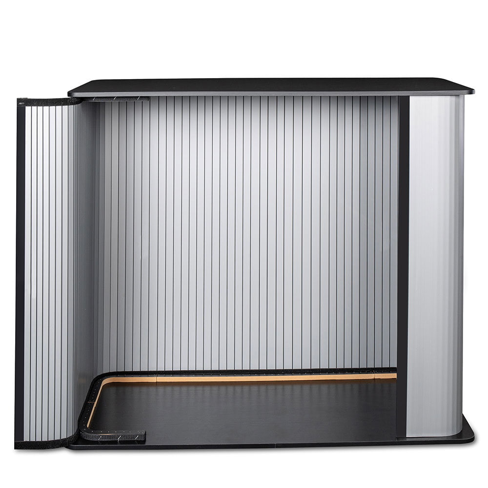 Die Wände dieses Systems bestehen aus zellularem PVC, das mit Klettverschlüssen an der Ober- und Unterseite befestigt wird. Dank dieser einfachen Konstruktion erfordert der Auf- und Abbau des Ständers kein Werkzeug und nimmt praktisch überhaupt keine Zeit in Anspruch. Der Sockel und robuste Tischplatte aus Holz garantieren hohe Qualität, Stabilität und eine lange Lebensdauer.